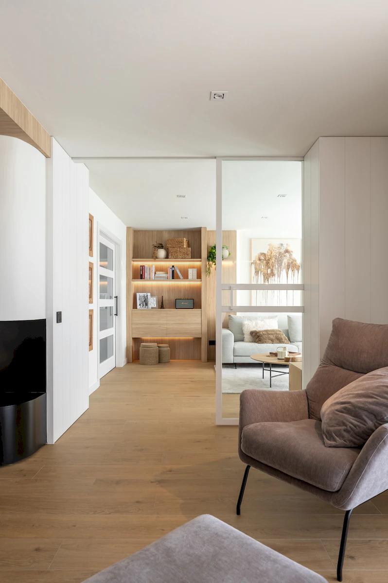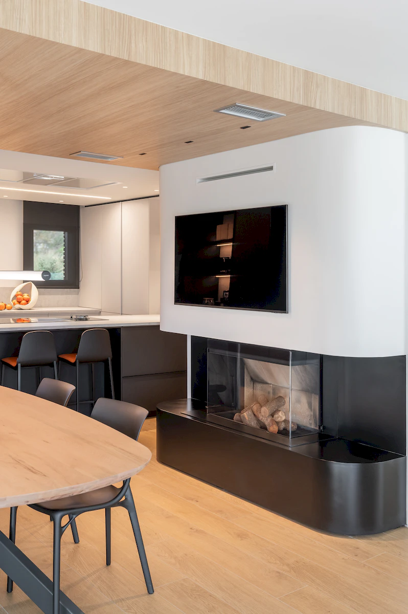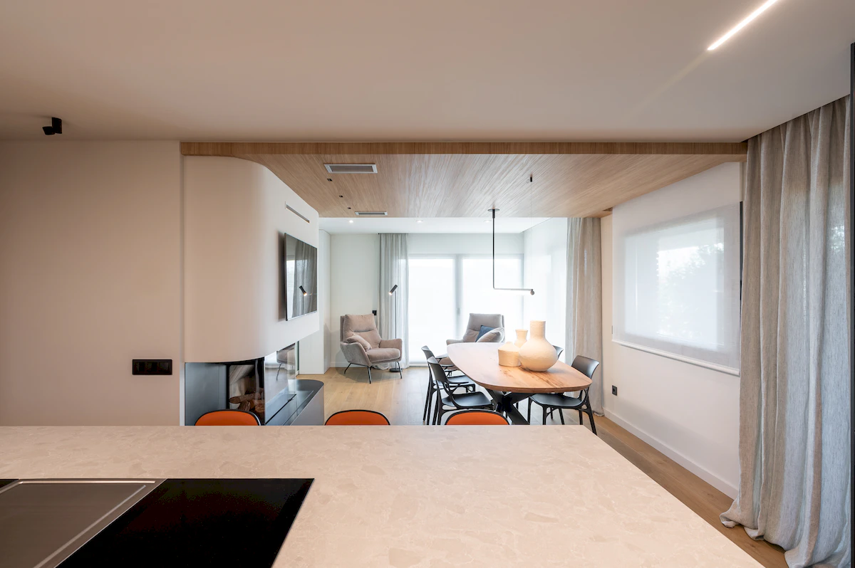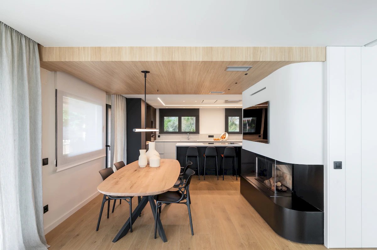 Reforma integral de la zona de dia d’un habitatge unifamiliar, on cuina i menjador conviuen en un espai obert i lluminós, connectat amb la sala a través d’una corredera de vidre que manté la continuïtat visual. La llar de foc articula el projecte, mentre que la fusta, els volums suaus i els tons neutres construeixen una atmosfera càlid, serena i atemporal.