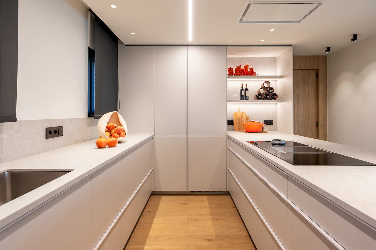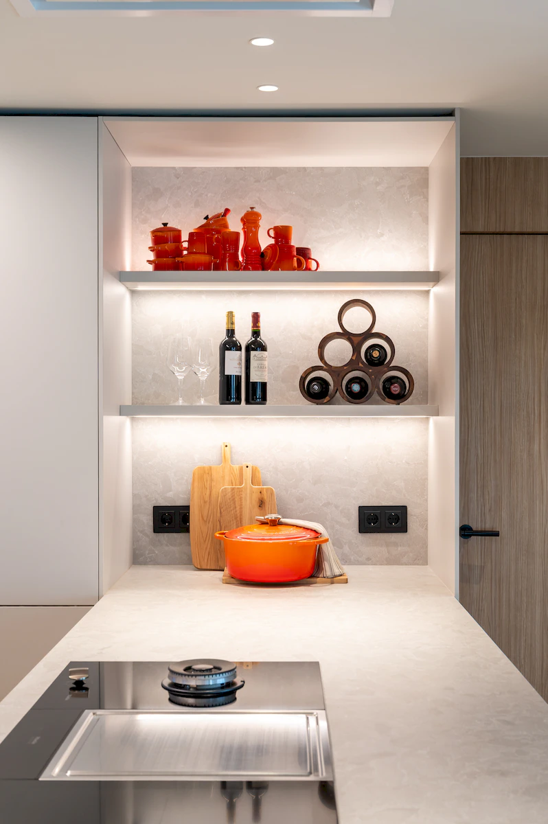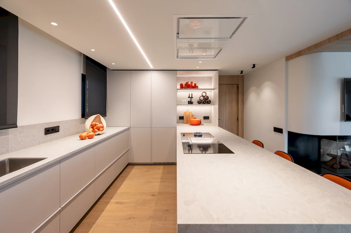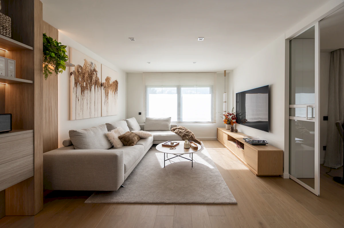 Reforma integral de la zona de dia d’un habitatge unifamiliar, on cuina i menjador conviuen en un espai obert i lluminós, connectat amb la sala a través d’una corredera de vidre que manté la continuïtat visual. La llar de foc articula el projecte, mentre que la fusta, els volums suaus i els tons neutres construeixen una atmosfera càlid, serena i atemporal.