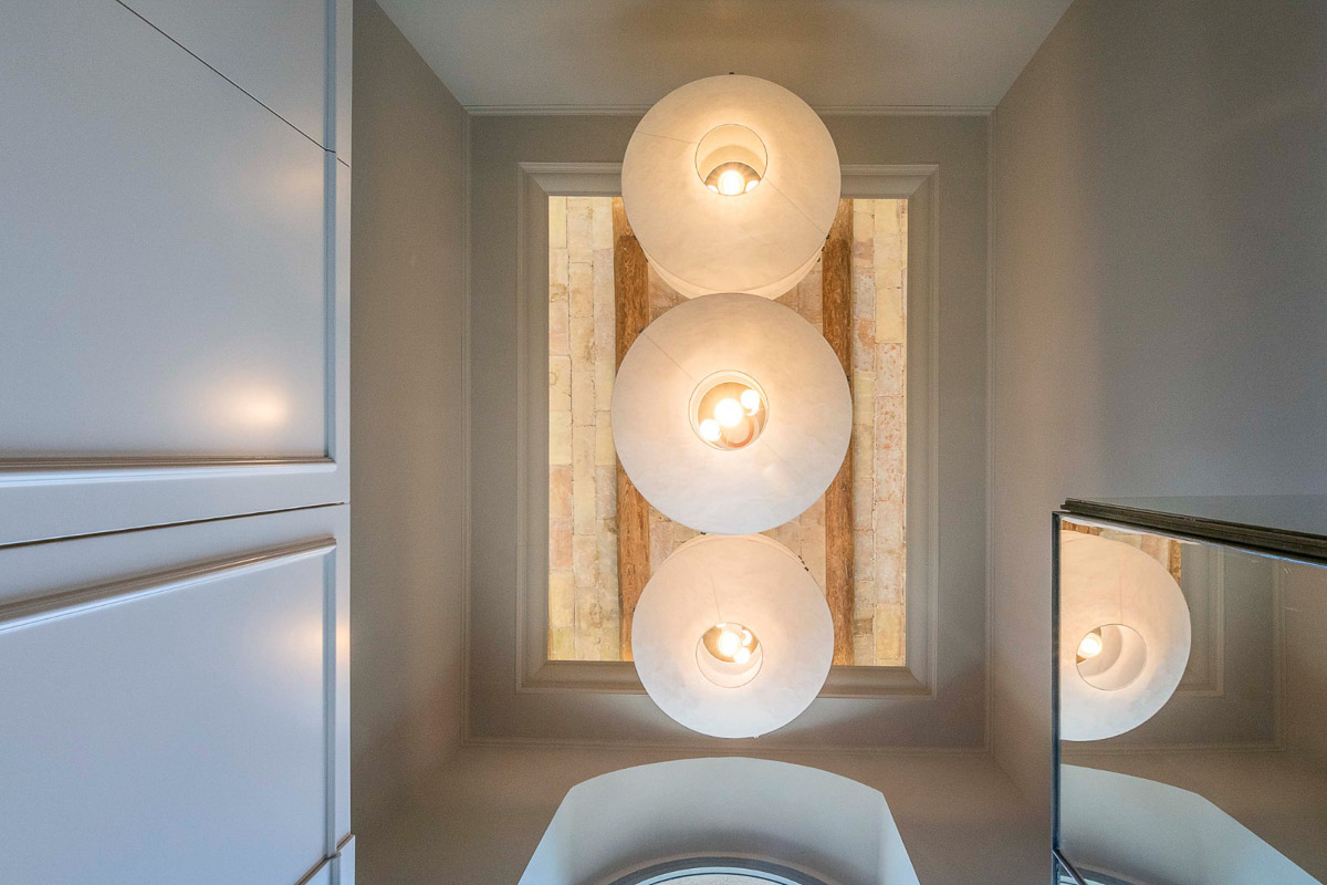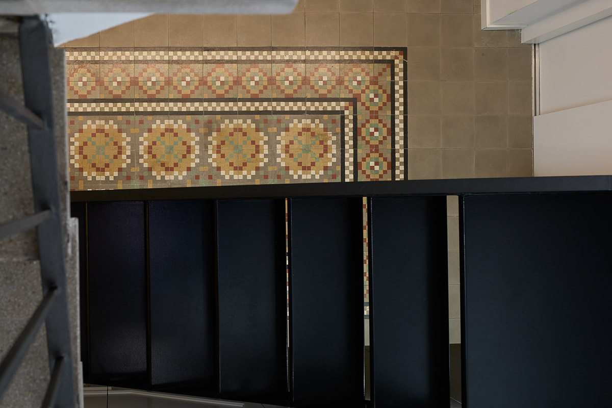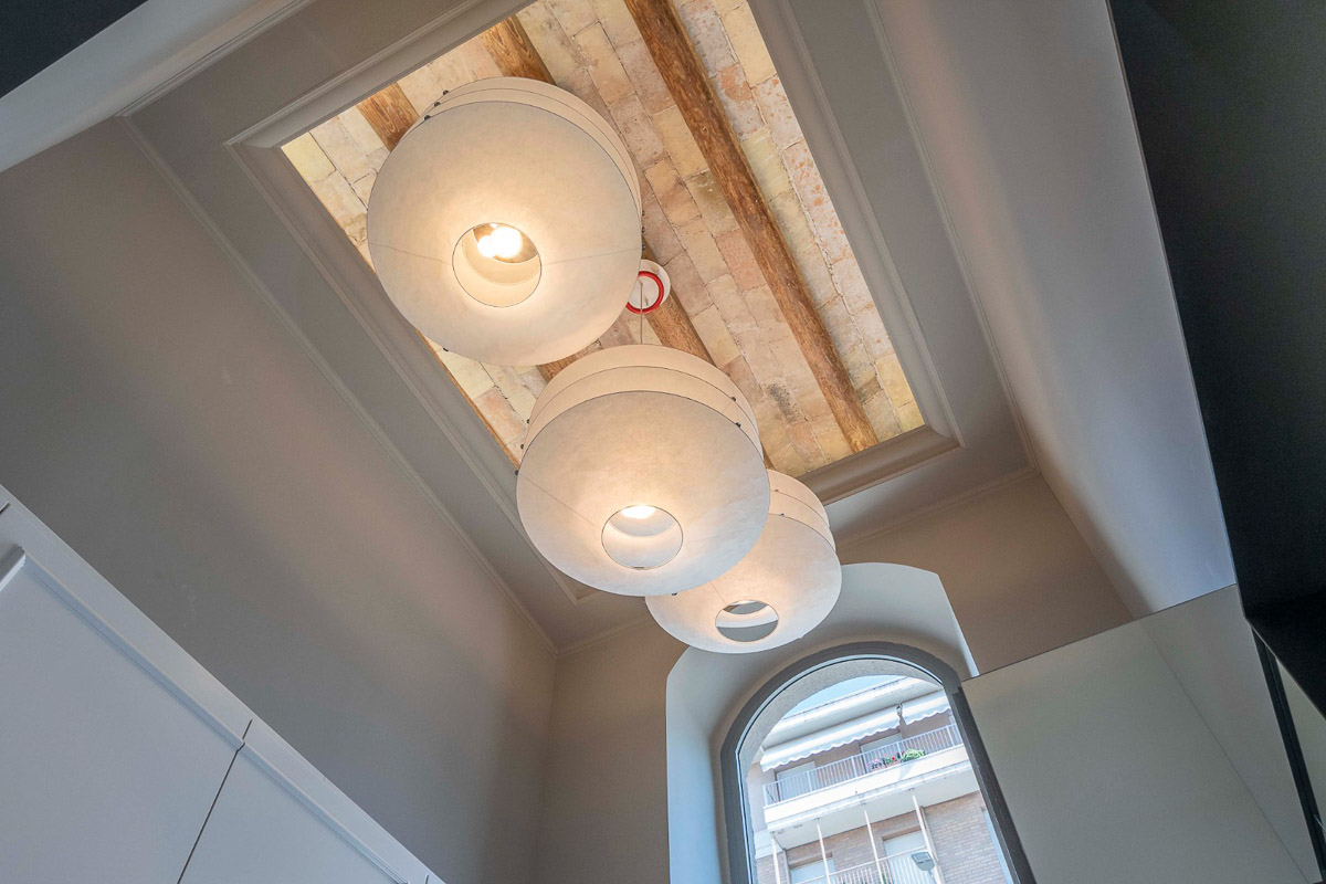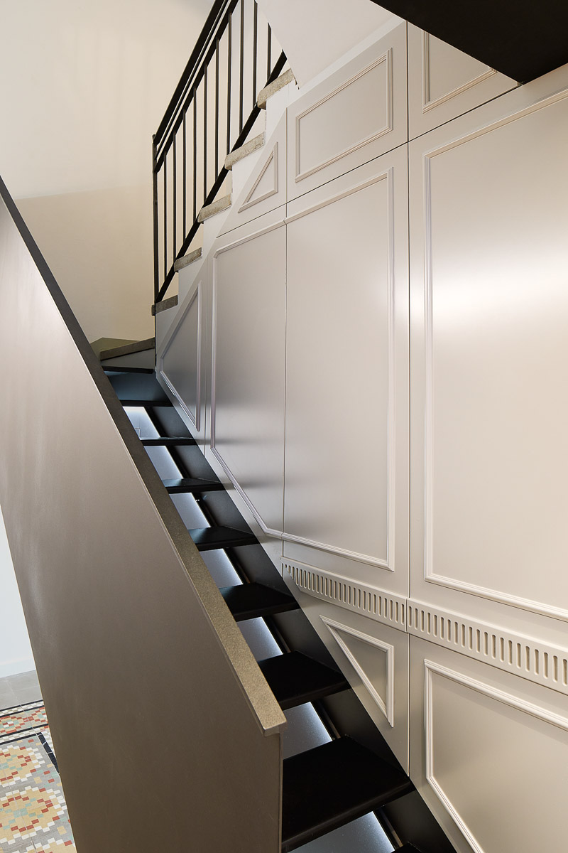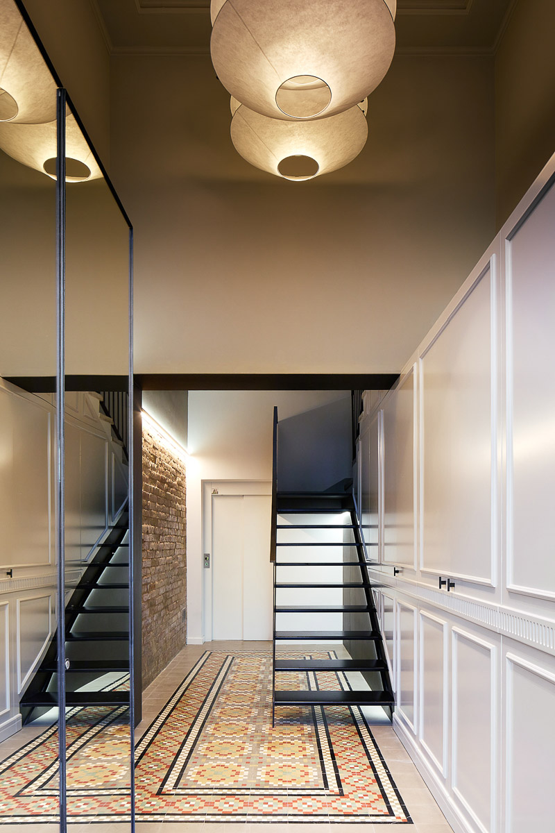 Creació de vestíbul d’entrada en edifici rehabilitat a Manresa. Ubicació d’elements comuns d’instal·lacions, disseny d’escala i proposta lumínica.