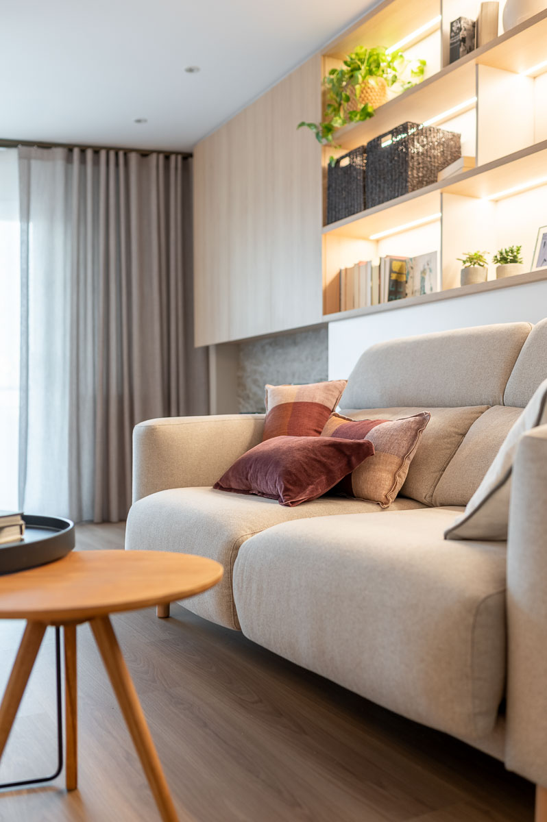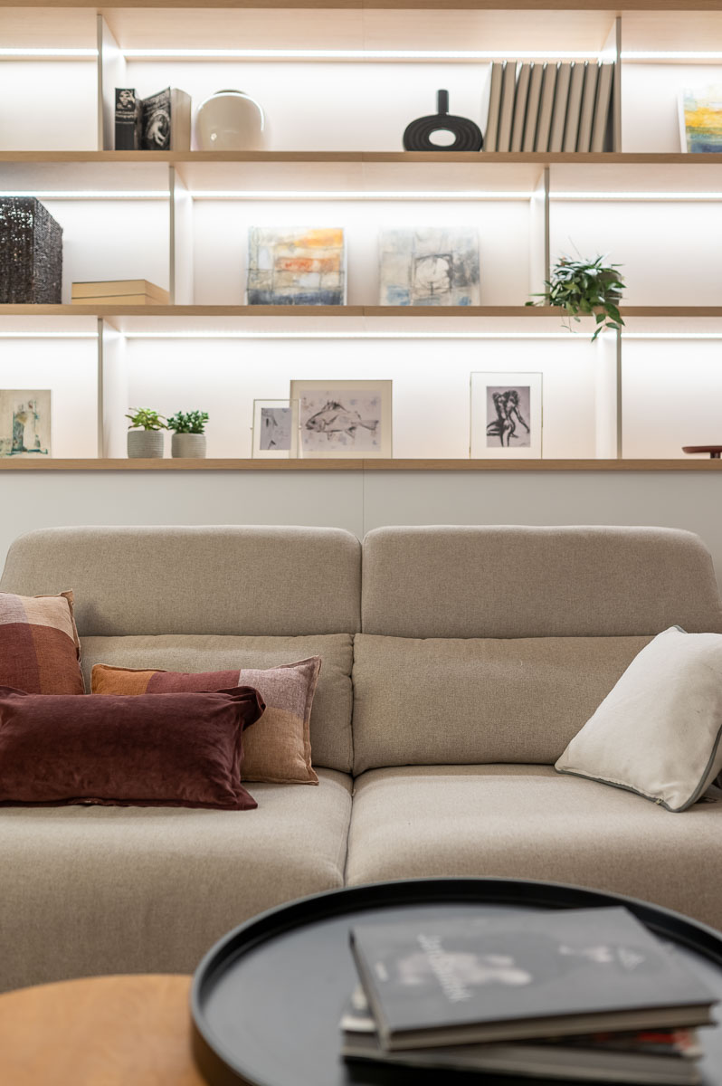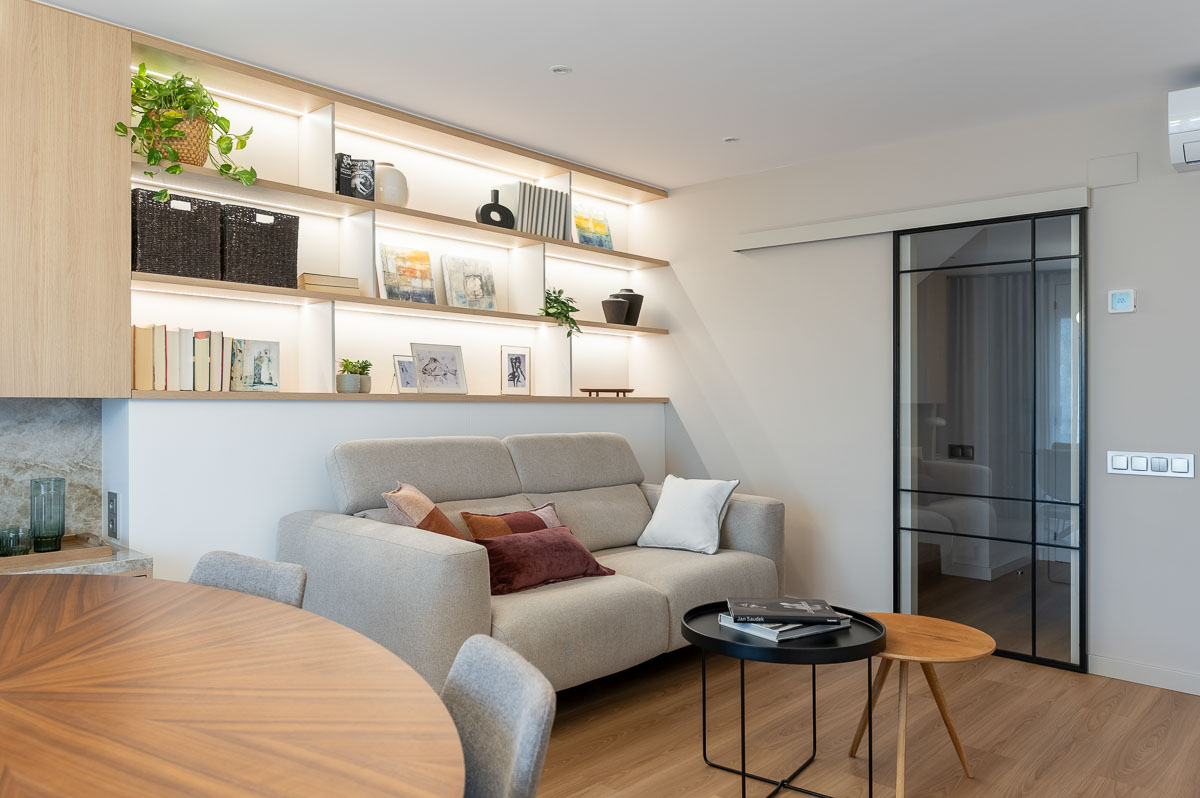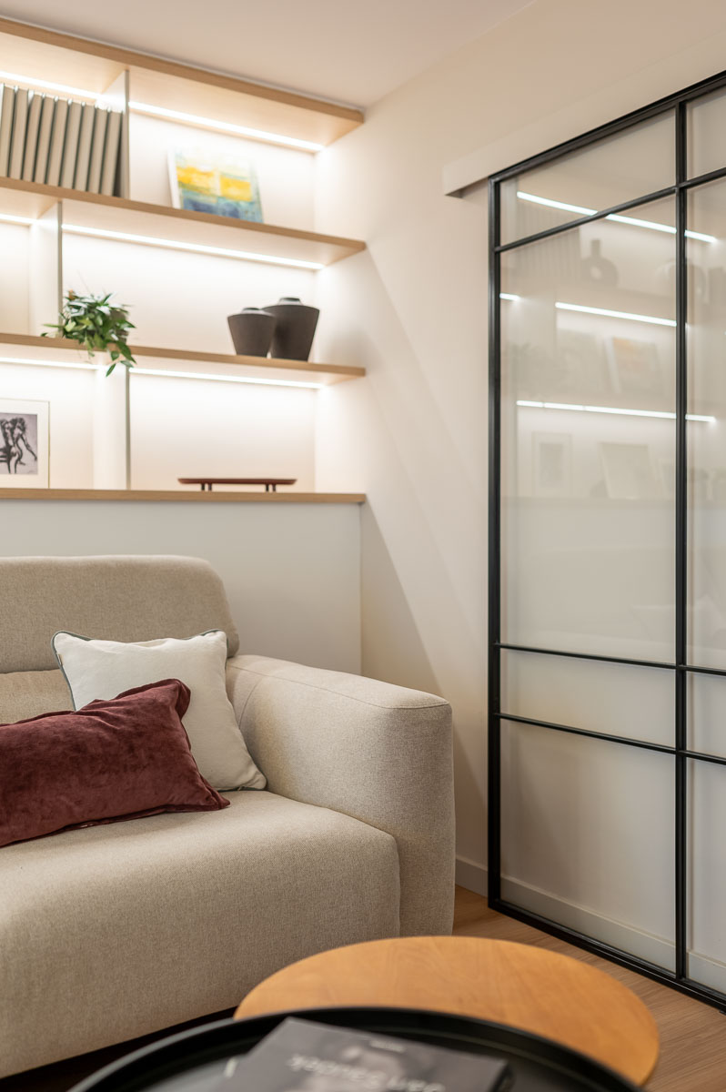 Apostem per un disseny del mobiliari a mida i unifiquem l'envolvent de l'espai aplacant i integrant les portes d'accés al despatx i a la cuina. Donem protagonisme a la porta principal amb un canvi d'estètica a corredera de ferro. Augmentem l'emmagatzematge i apostem per la llum indirecta.