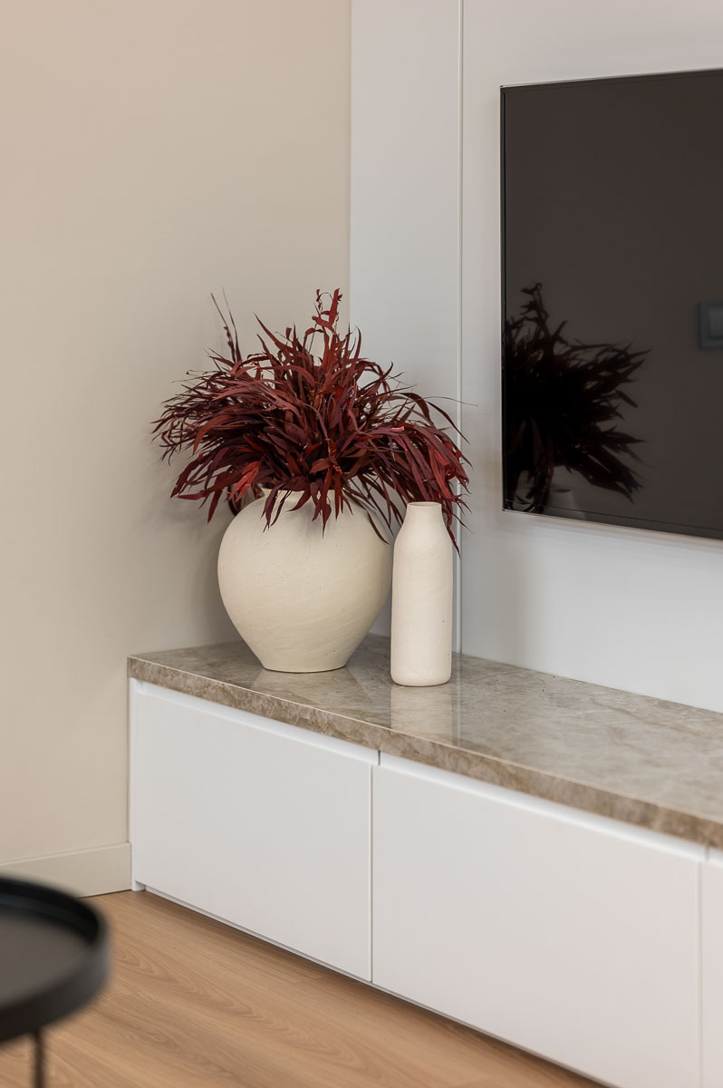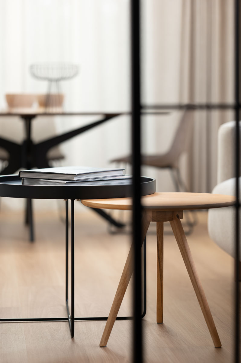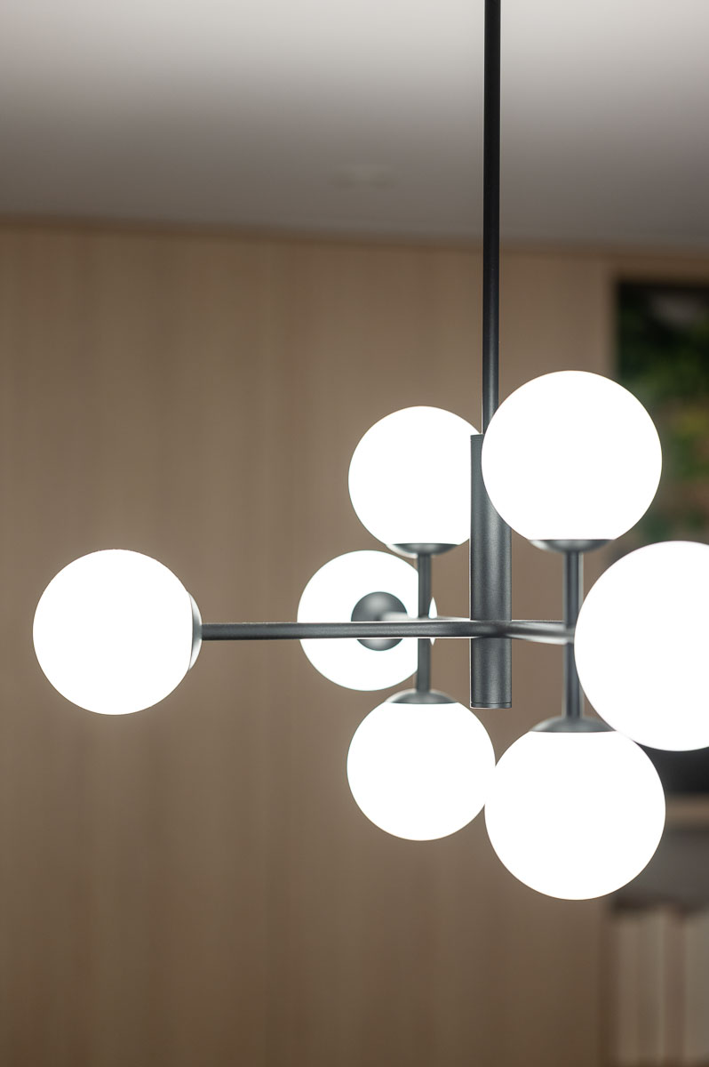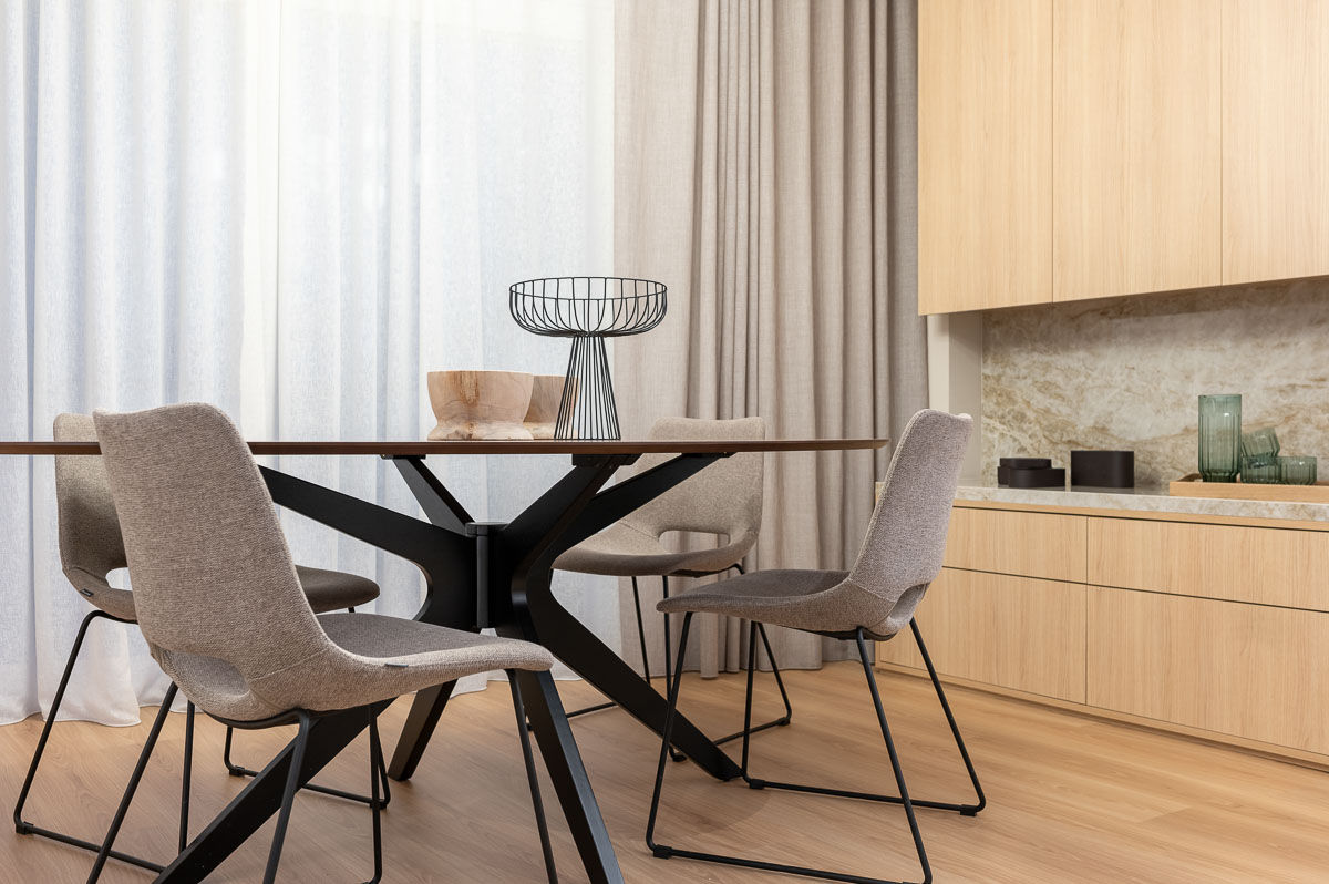 Apostem per un disseny del mobiliari a mida i unifiquem l'envolvent de l'espai aplacant i integrant les portes d'accés al despatx i a la cuina. Donem protagonisme a la porta principal amb un canvi d'estètica a corredera de ferro. Augmentem l'emmagatzematge i apostem per la llum indirecta.