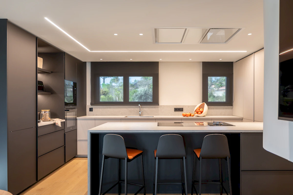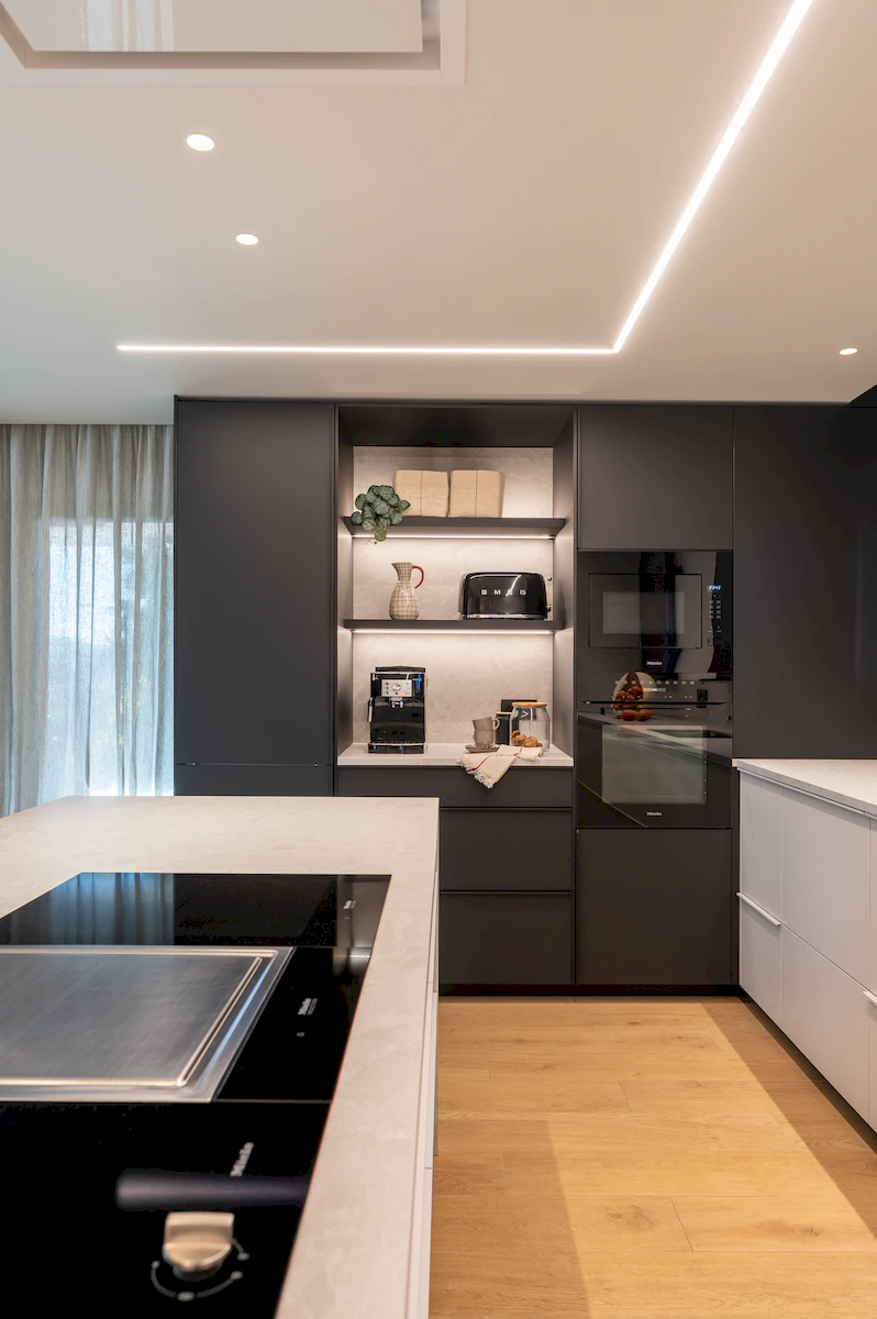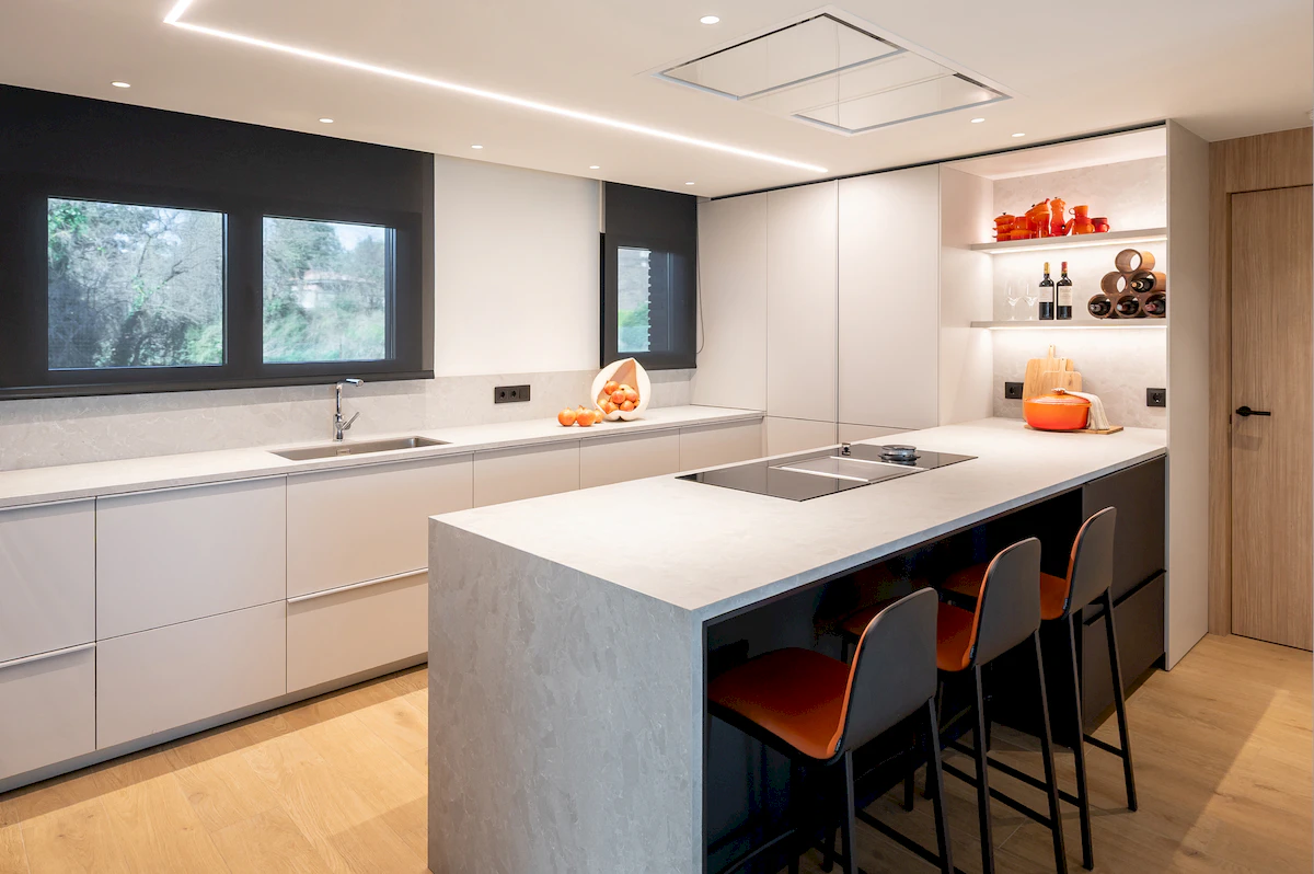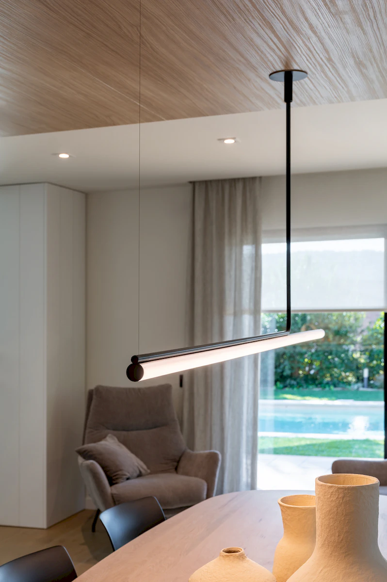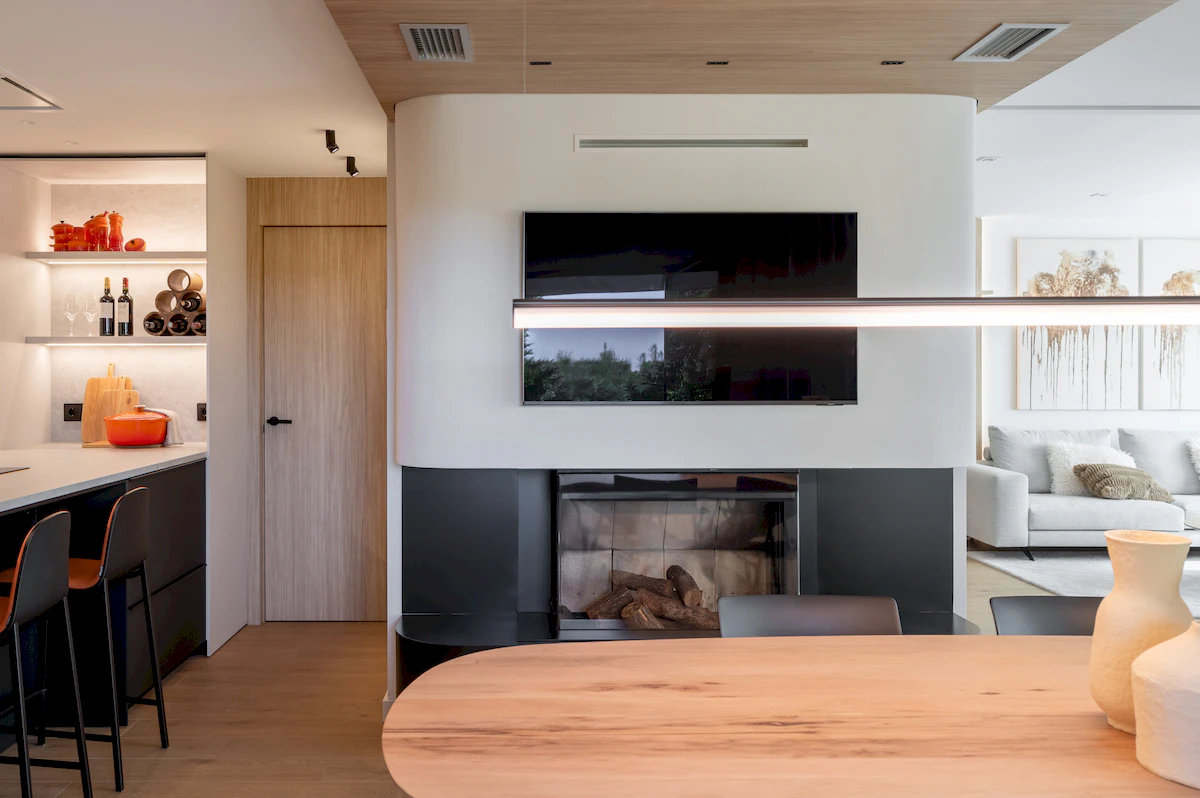 Reforma integral de la zona de dia d’un habitatge unifamiliar, on cuina i menjador conviuen en un espai obert i lluminós, connectat amb la sala a través d’una corredera de vidre que manté la continuïtat visual. La llar de foc articula el projecte, mentre que la fusta, els volums suaus i els tons neutres construeixen una atmosfera càlid, serena i atemporal.