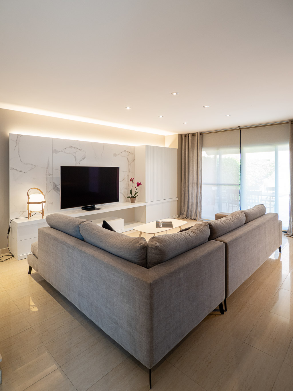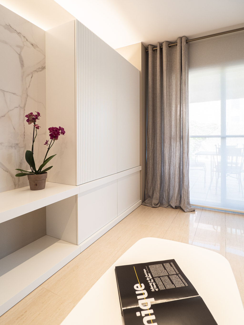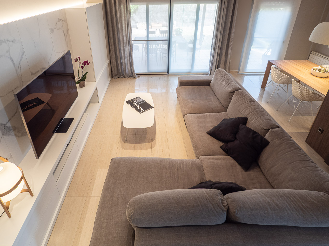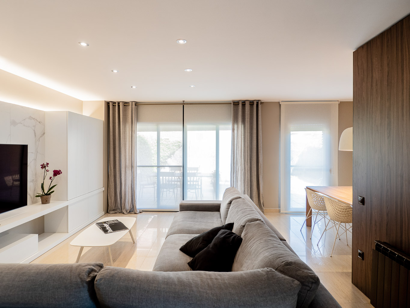 Apostem per un canvi total en l’estètica d’aquesta sala d’estar – menjador, revestint parets, homogeneïtzant tons, escollint nou mobiliari i fabricant-ne a mida per tal d’aconseguir un ambient elegant i molt pràctic. Donem la volta al bany de cortesia, creant un box central on el seu interior i exterior es vinculen perfectament a la resta de l’espai.