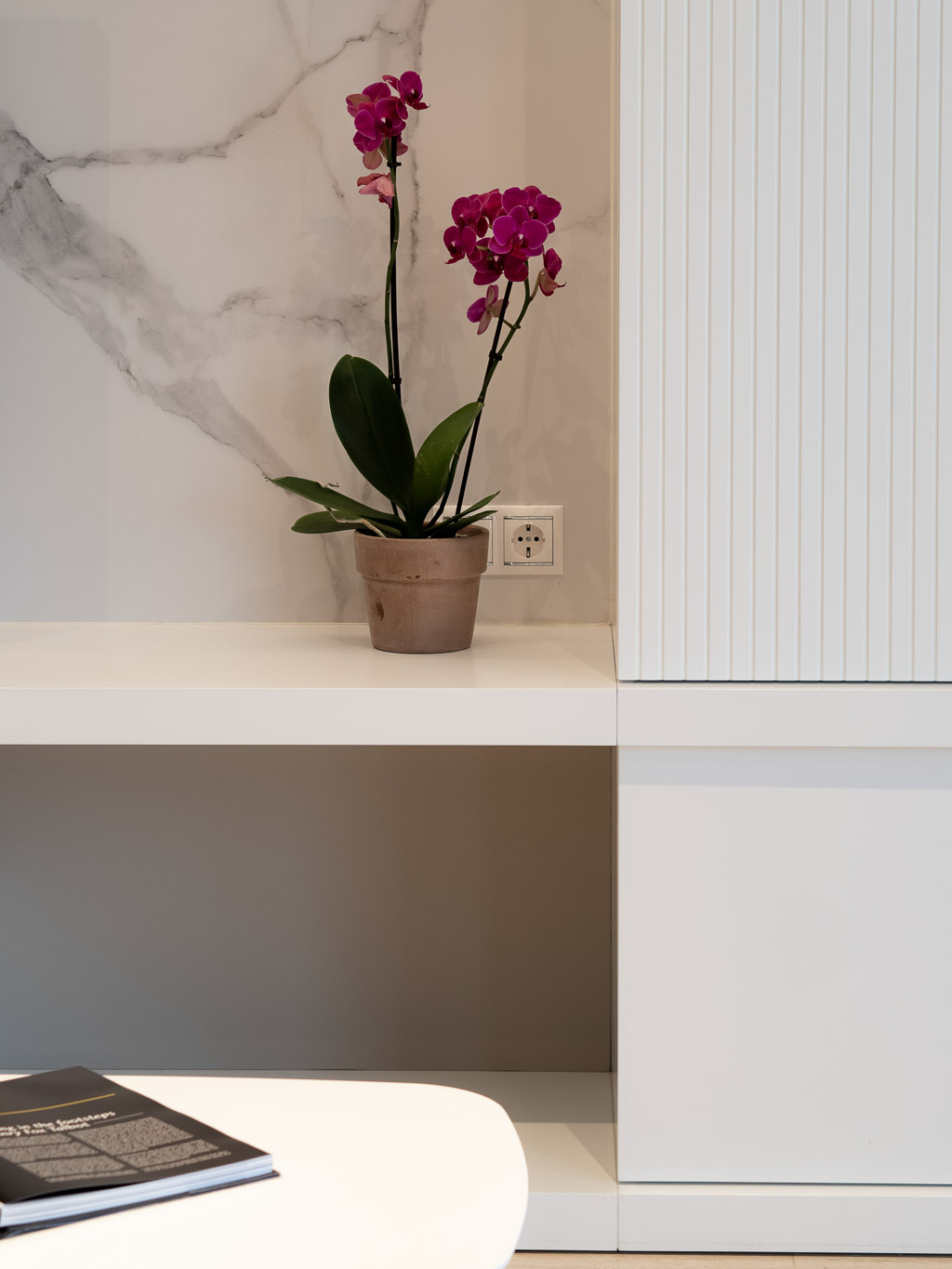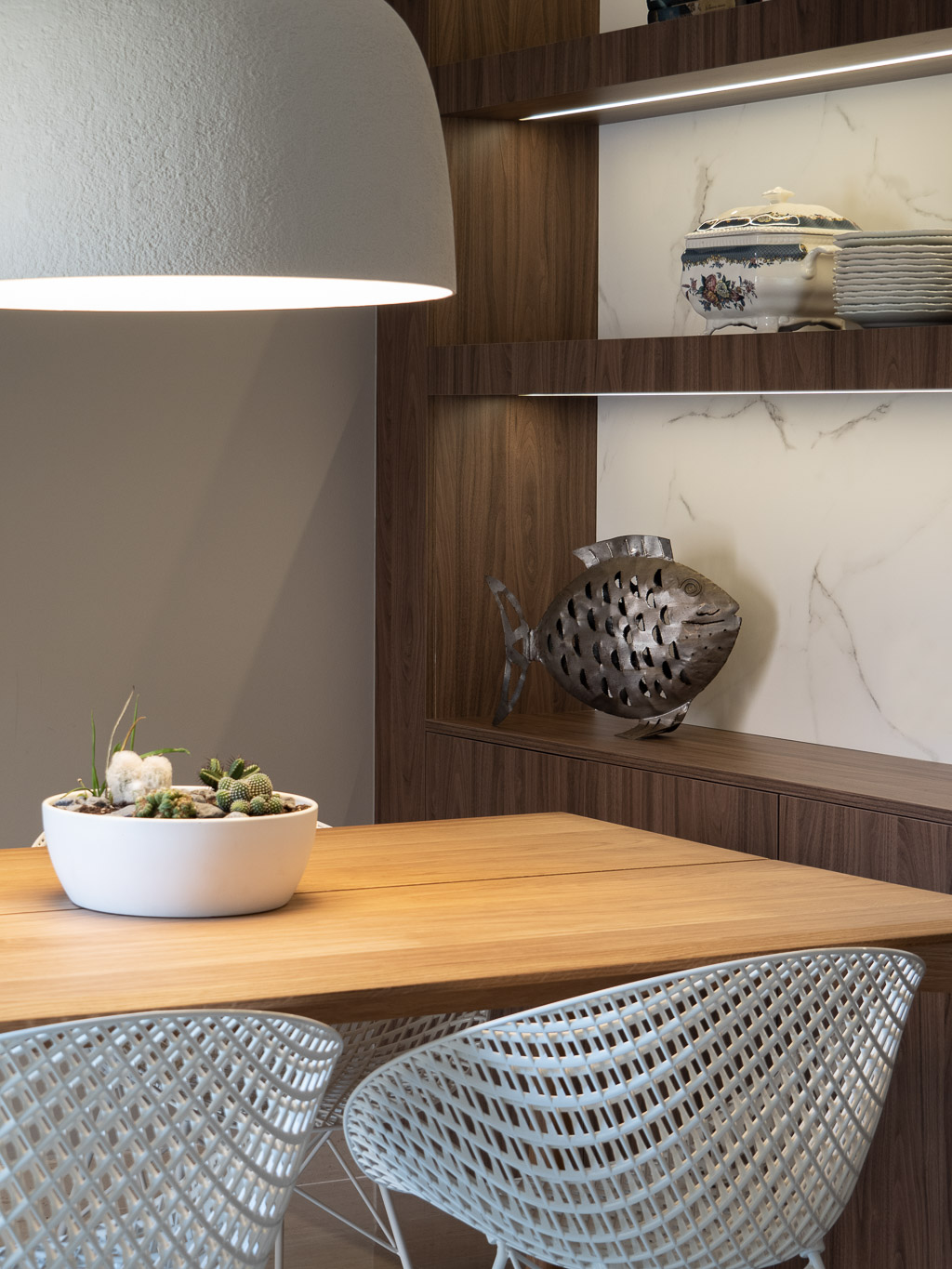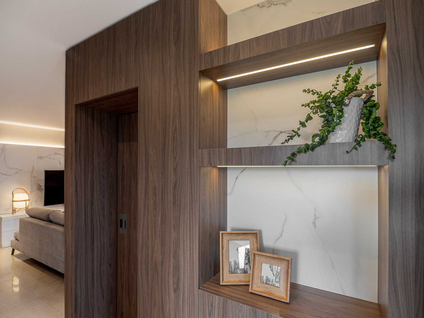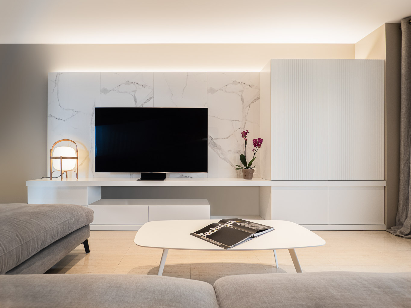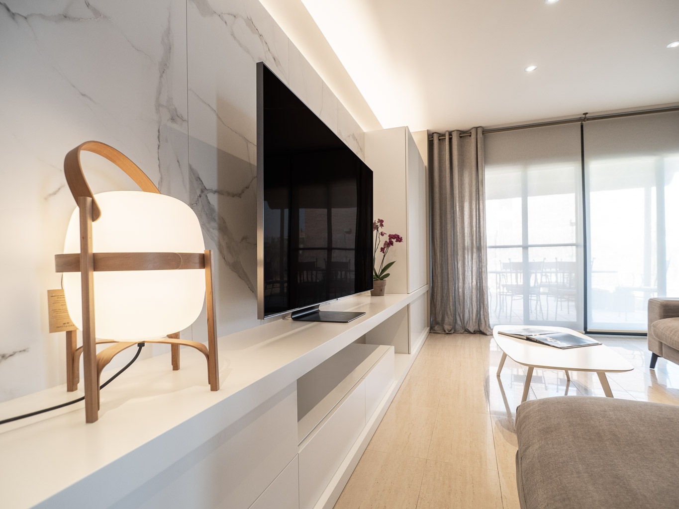 Apostem per un canvi total en l’estètica d’aquesta sala d’estar – menjador, revestint parets, homogeneïtzant tons, escollint nou mobiliari i fabricant-ne a mida per tal d’aconseguir un ambient elegant i molt pràctic. Donem la volta al bany de cortesia, creant un box central on el seu interior i exterior es vinculen perfectament a la resta de l’espai.